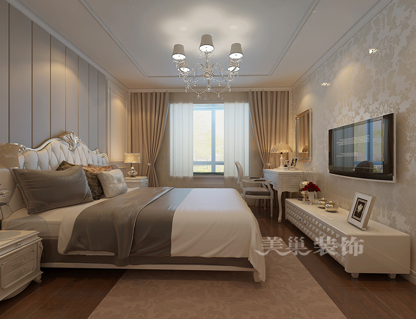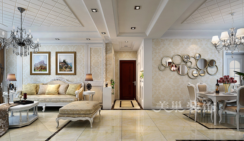 美巢郑地美景东望四室两厅装修样板间-欧式风也可以端庄,案例出自美巢装饰140平四室两厅,选用了简欧风的优雅与含蓄感,端庄和优雅是整个设计思路的灵魂,色彩的搭配是业主的需求,用石材和实木线条为元素,吊顶设计为无灯池吊顶,简洁但不单调,使整个空间显得稳重大气。