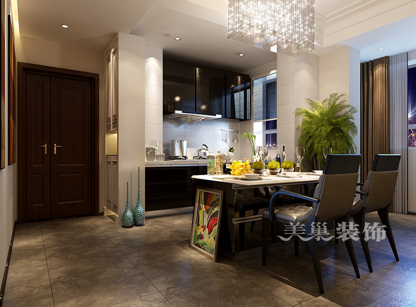 郑州汇泉西悦城89平三室装修多少钱-2人的开放式厨房,案例出自美巢装饰,这个小三房的户型,整体要求时尚实用相结合,希望在不是很大的空间里能充分利用区域功能,使得空间鲜明大方,舒适得体,稍显档次感。用黑白灰来演绎空间层次,加以黑镜、硬包及金属的点缀,更显得高端了不少。