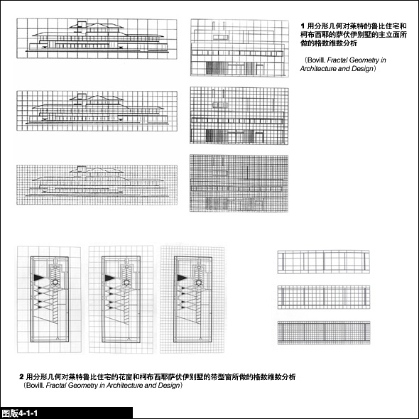 在建筑的外立面构图分析中,我们可以用格数维数这一概念来衡量建筑外观的丰富程度。如果我们对莱特的鲁比住宅分别施加12英寸、6英寸和3英寸的网格,计算每两次之间的格数维数,可得到1.485和1.441;把类似的网格施加到柯布西耶的萨伏伊别墅上,可得到的格数维数是1.422和1.333。这说明鲁比住宅比萨伏伊别墅的立面变化要多一些,但差距不是很大。但如果我们选取鲁比住宅上的典型花窗和萨伏伊别墅上的带 形窗再做一次分析的话,前者的格数维数是1.721和1.626,而后者是1.233和1.000,这里的差距就比较大了。事实上,如果把鲁比住宅的这一花窗和分形几何代表形体之一的塞尔平斯基填图(Sierpinski Gasket)进行对比的话,不难发现它们的共性。可以说,莱特所代表的有机建筑在其立面构图上不自觉地使用了自相似的方法,得到了视觉上的丰富层次(图版4-1-1)。