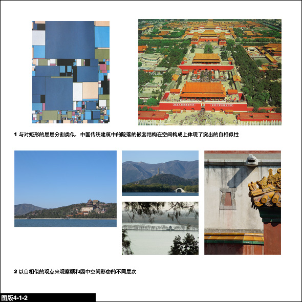 运用分形几何对建筑的空间构成进行分析,也可以从另一个方面揭示有机空间的法则。我国传统建筑常以类似的单体建筑的组合形成丰富的空间,达到建筑视觉和空间体验上与自然的和谐,这一点是可以用分形几何的自相似规律来解释的。我们可以把整个故宫看成是一个大的院子,有其主要的轴线、朝向和空间围合构成,这是第一层次;第一层次的的围合体、空间本身又被用类似的方式划分成若干小的院子,组成其主要的建筑群落,这是第二层次;第二层次中相对较大的院子和围合体又被进一步划分成小的院子,形成第三个层次,其中有些还被进一步划分成第四个层次,才落实到最终物化的墙体和单体建筑。把这种嵌套的的空间构成方式与嵌套的黄金分割相比,是有很大的共性的。我们可以说,这种空间构成法则上的自相似性是故宫这样的传统中国建筑群不同于西方建筑的原因,它使得中国古建筑群虽然在单体建筑上简单乏味,但在群体构成上却能达到层次丰富、秩序鲜明又不失自然统一的效果。类似地,我们可以观察颐和园在空间体验上的构成,水平向的延伸与接近尽端点的突起不仅是整个园区景观的构成方式,也是园中重要景点、园中园的构成法式,这一构成方式甚至最终延伸到每个单体构筑物的檐角上。它的自相似性是无庸质疑的 (图版4-1-2)。[回本章页首]