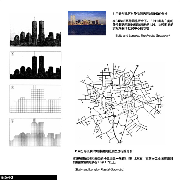 分形几何学当然也对城市研究有着积极的作用。事实上,由于城市研究中带有客观性的、可量化的问题更多,分形几何学不仅能够起到形态分析的作用,而且还更为辅助复杂的决策提供数学工具。届于这方面的专业化研究已超出了我们的课程所关注的范围,在此我们只在图 版4-2中提供两个示例。一个是对九一一袭击前的曼哈顿天际线的分析,另一个是对英国中小城市路网分维数的分析。[回本章页首]